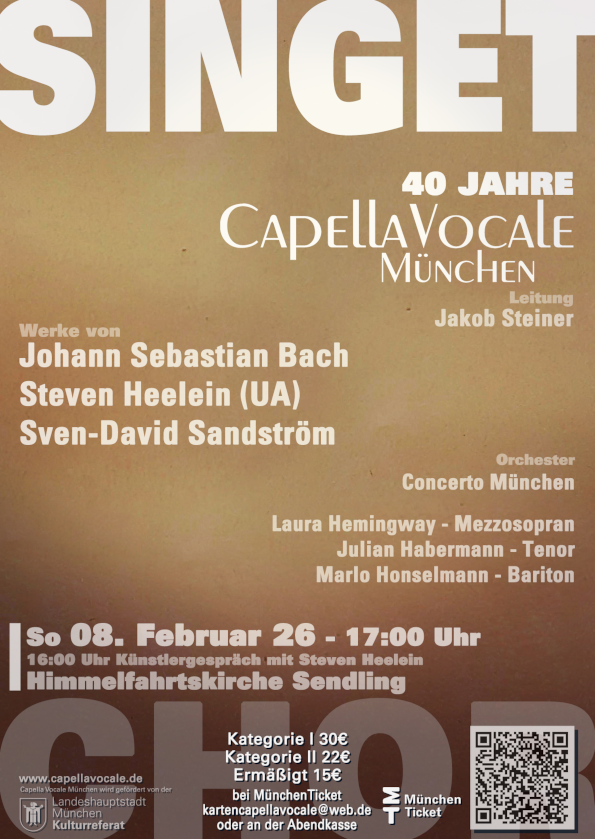 Bestehens findet am 8. Februar 2026 um 17 Uhr in der Himmelfahrtskirche München-Sendling statt. Auf dem Programm stehen unter anderem ein Auftragswerk des Komponisten Steven Heelein für Chor und Orchester sowie Werke von Johann Sebastian Bach und Sven-David Sandström.